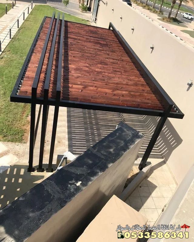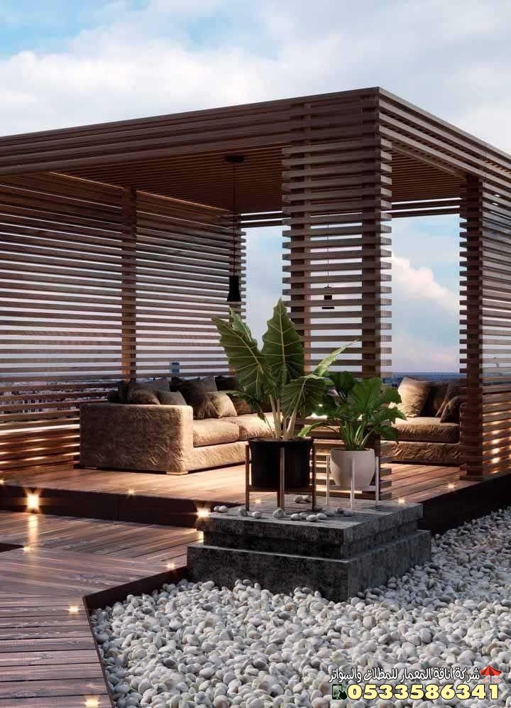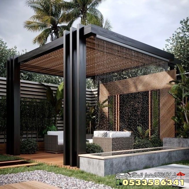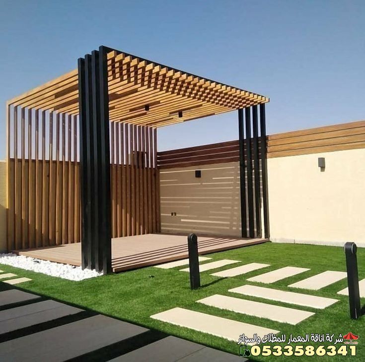 - برجولات خشبية حديثة: التي تتميز بتصميمات أنيقة توفر الظل مع إضفاء طابع دافئ وطبيعي على الجلسات الخارجية.